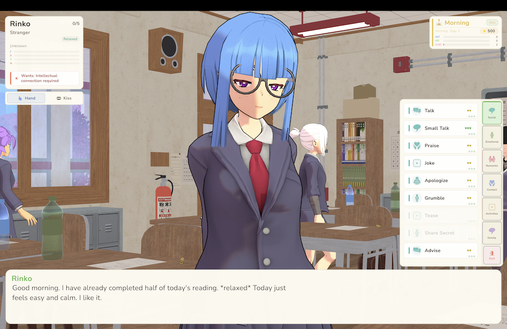 - 6 relationship stages: Stranger, Acquaintance, Friend, Close Friend, Crush, and Dating