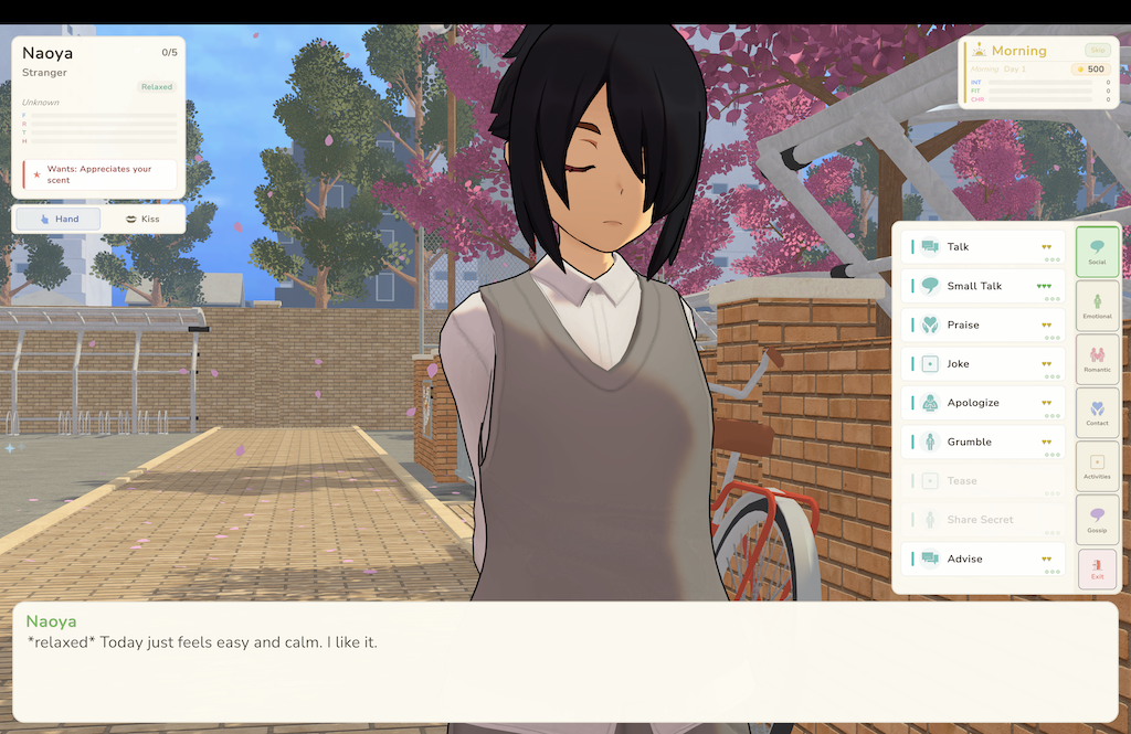Conversations aren't just picking dialogue options. You choose actions and the outcome depends on everything: personality, mood, relationship history, where you are, what time it is, and your own stats.